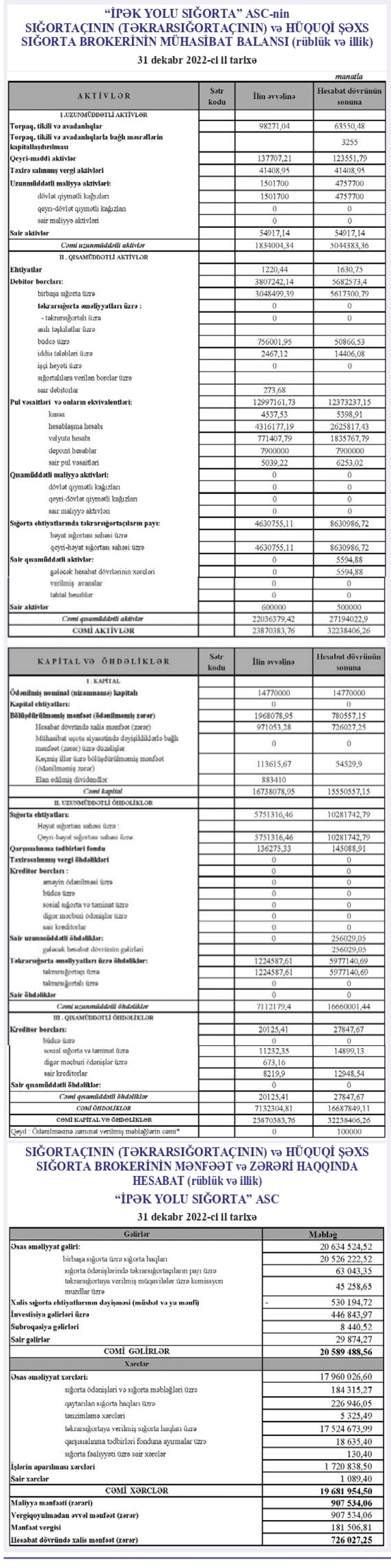 "İpək Yolu Sığorta" ASC 2022-ci ili 726 min manat xalis mənfəət ilə başa vurub. Şirkət 2021-ci ili 971 min manat xalis mənfəət ilə bağlamışdı. Beləliklə, "İpək Yolu Sığorta"nın xalis mənfəəti 25,2% azalıb.
