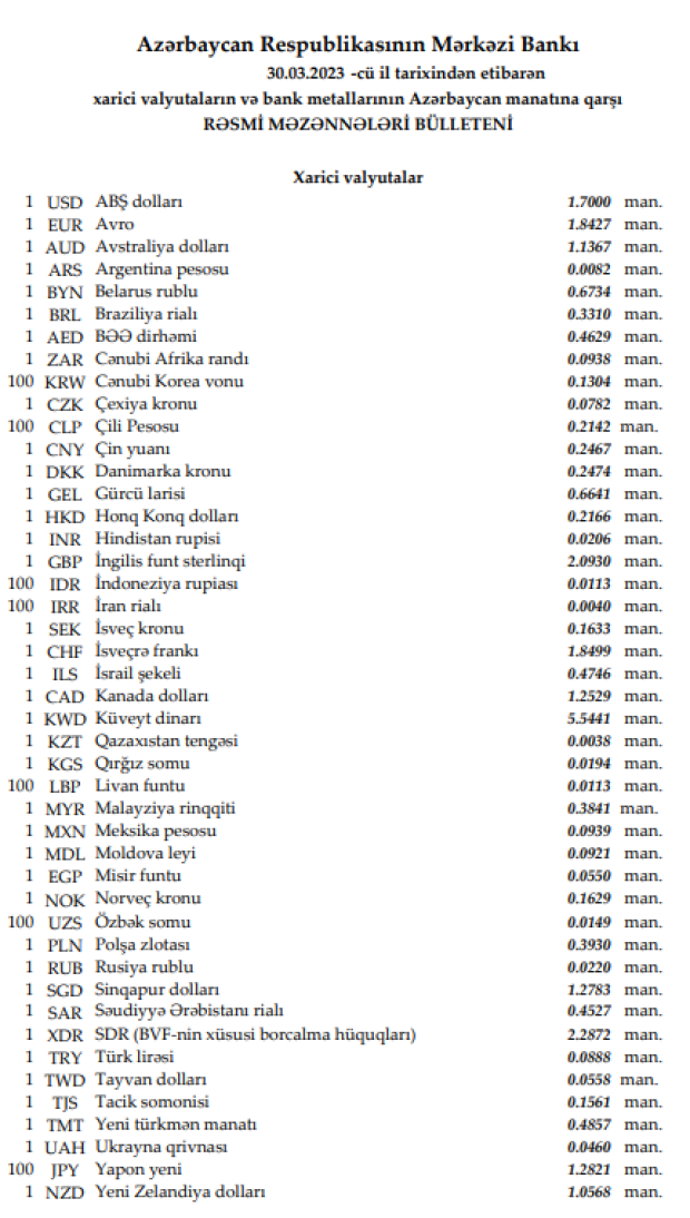 Rəsmi məzənnələr açıqlandı