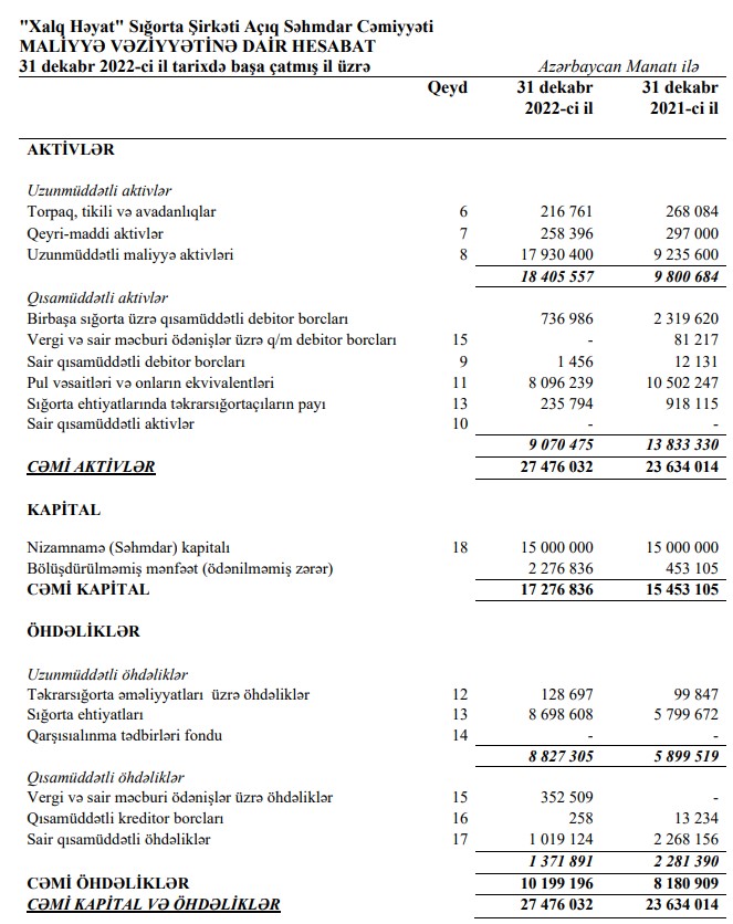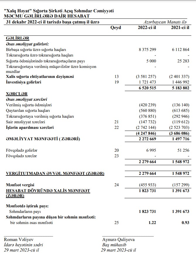 "Xalq Həyat" Sığorta Şirkəti ASC 2022-ci ili 1 milyon 824 min manat xalis mənfəət ilə başa vurub. Şirkət 2021-ci ili 1 milyon 392 min manat xalis mənfəət ilə bağlamışdı. Beləliklə, "Xalq Həyat"ın xalis mənfəəti 2021-ci illə müqayisədə 2022-ci ildə 31% artıb.