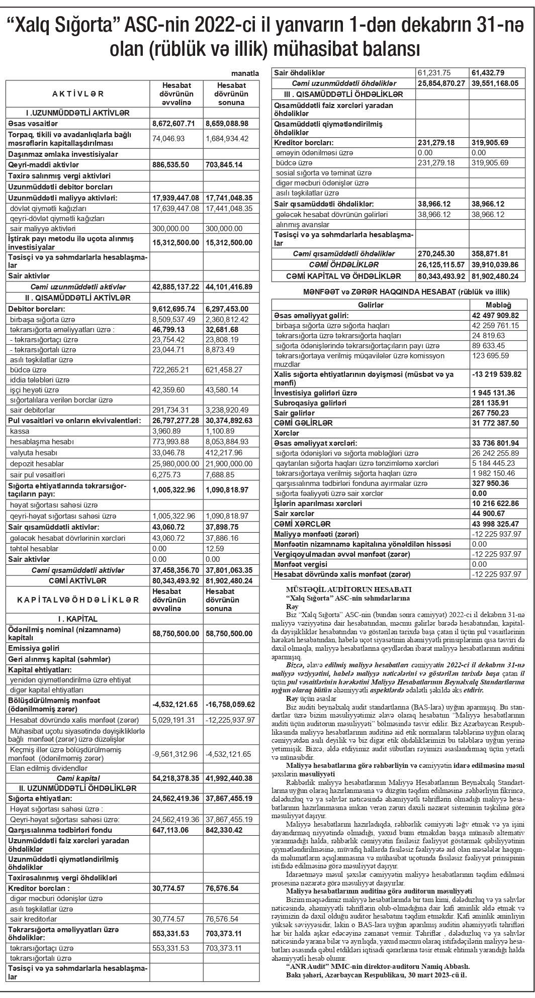 "Xalq Sığorta" ASC sığorta ehtiyatına 13 milyon 219 min manat ayırdığı üçün 2022-ci ili 12 milyon 226 min manat xalis zərər ilə başa vurub. Şirkət 2021-ci ili 5 milyon 29 min manat xalis mənfəət ilə bağlamışdı.