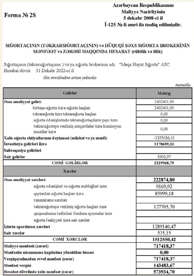 “Meqa Həyat Sığorta” ASC 2022-ci ili 574 min manat xalis mənfəət ilə başa vurub.Şirkət 2021-ci ili 182 min manat xalis mənfəət ilə başa vurmuşdu. Beləliklə, “Meqa Həyat Sığorta” xalis mənfəəti 2021-ci illə müqayisədə 2022-ci ildə 392 min manat və ya 3,1 dəfə artıb.