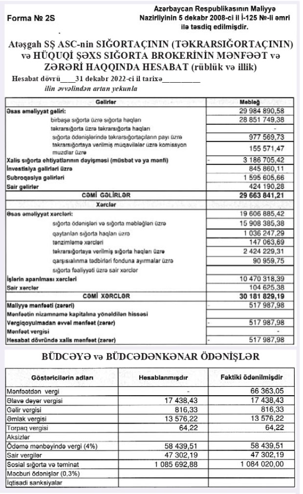 "Atəşgah Sığorta Şirkəti" ASC 2022-ci ili 518 min manat xalis zərər ilə başa vurub.