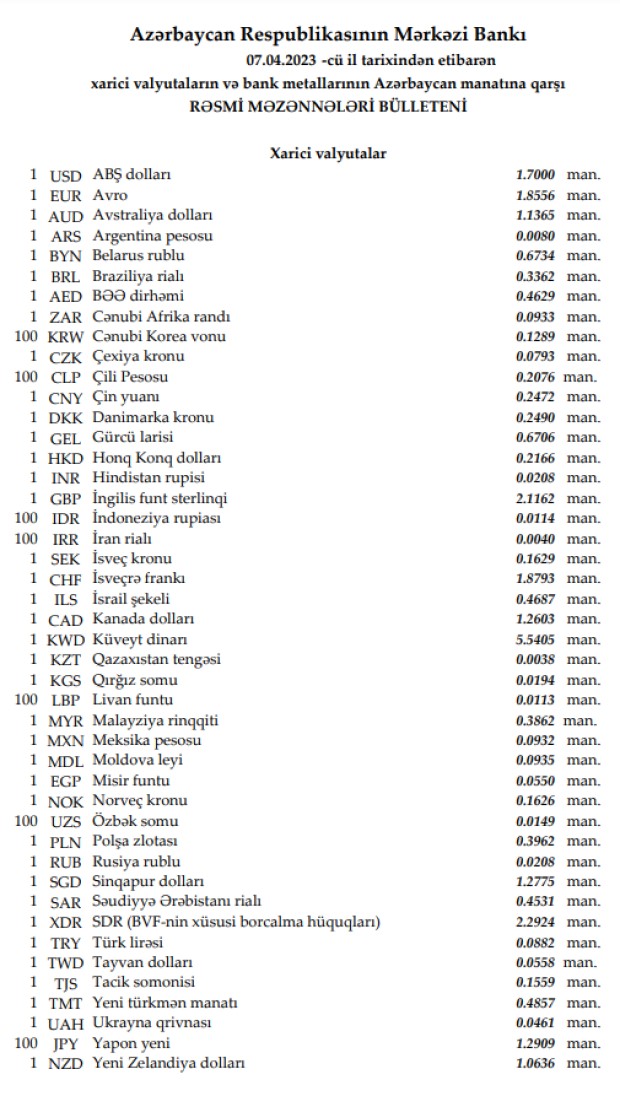 Rəsmi məzənnələr açıqlandı