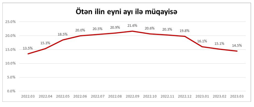 Belə ki, tez köhnələn qida məhsullarının qiymətində keçən ilin mart ayına nisbətən 18.3% artım, quru, dondurulmuş qida məhsullarının, şirniyyat və spirtsiz içkilərin qiymətində 14.8% artım, spirtli içkilər və tütün məmulatlarının qiymətində 4.7%, gigiyena və təmizlik vasitələrinin qiymətində isə 15.7% artım izlənilib.