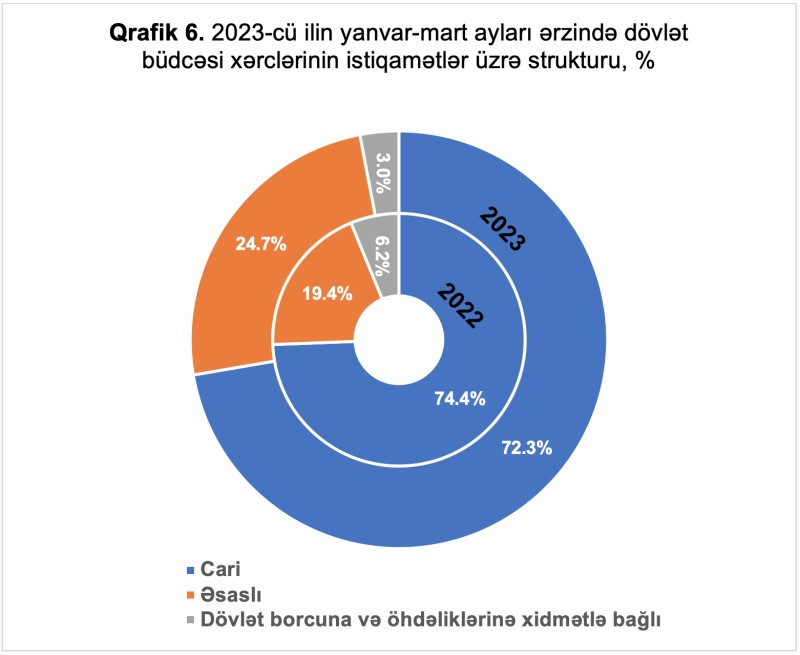 2023-cü ilin yanvar-mart ayları ərzində dövlət büdcəsi xərclərinin 4 milyard 749,6 milyon manatı və ya 72,3 faizi cari xərclərə, 1 milyard 619,3 milyon manatı və ya 24,7 faizi əsaslı xərclərə, 198 milyon manatı və ya 3,0 faizi dövlət borcuna və öhdəliklərinə xidmətlə bağlı xərclərə yönəldilmişdir.