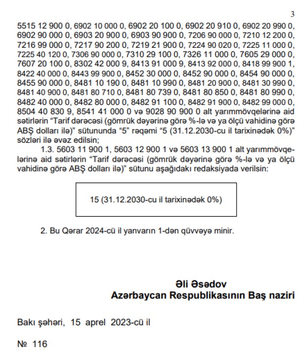 Bununla bağlı Baş nazir Əli Əsədov Nazirlər Kabinetinin “Azərbaycan Respublikasının xarici iqtisadi fəaliyyətin mal nomenklaturası, idxal gömrük rüsumlarının dərəcələri və ixrac gömrük rüsumlarının dərəcələri”ndə dəyişiklik edilməsi barədə qərar imzalayıb.