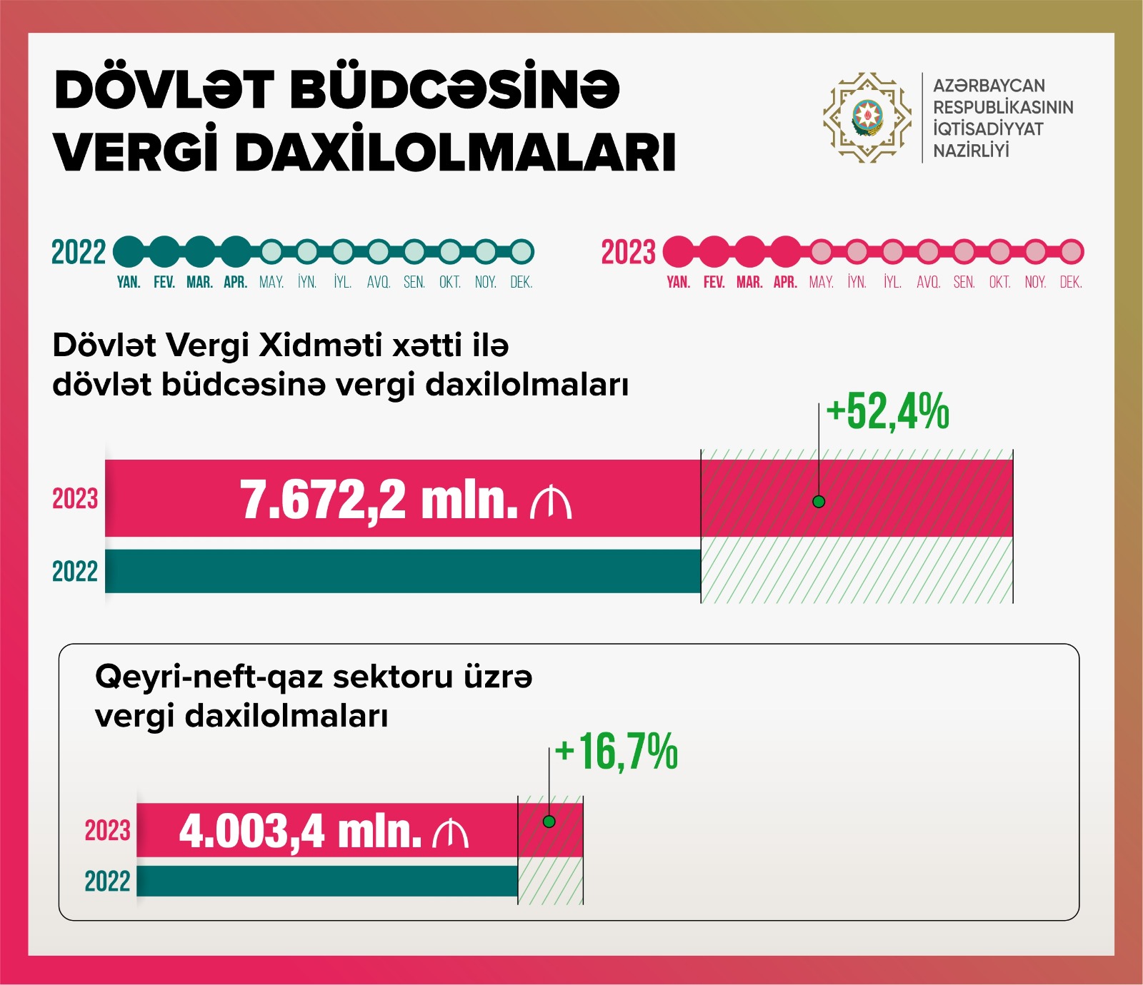 2023-cü ilin yanvar-aprel aylarında Dövlət Vergi Xidmətinin xətti ilə dövlə tbüdcəsinə vergi daxilolmalarının həcmi 2022-ci ilin müvafiq dövrü ilə müqayisədə 52,4% artaraq 7 milyard 672,2 milyon manat təşkil edib.