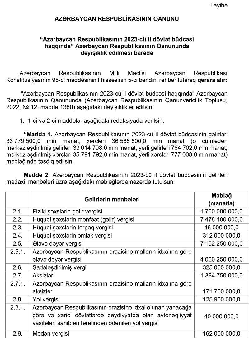 2023-cü ilin dövlət və icmal büdcələrinə dəyişikliklərin edilməsi ilə bağlı qanun layihəsi Milli Məclisə təqdim olunub. Yenidən baxılmış 2023-cü il dövlət büdcəsinin gəlirləri 33 milyard 779,5 milyon manat proqnozlaşdırılır ki, bu da təsdiq olunmuş göstəriciyə nisbətən 3 milyard 5,5 milyon manat və ya 9,8 faiz çoxdur. Yenidən baxılmış 2023-cü il dövlət büdcəsinin xərcləri 36 milyard 568,8 milyon manat məbləğində proqnozlaşdırılır ki, bu da təsdiq olunmuş göstəriciyə nisbətən 3 milyard 215,5 milyon manat və ya 9,6 faiz, 2022-ci ilin faktiki icra göstəricisi ilə müqayisədə isə 4 milyard 504,2 milyon manat və ya 14,0 faiz çoxdur.
