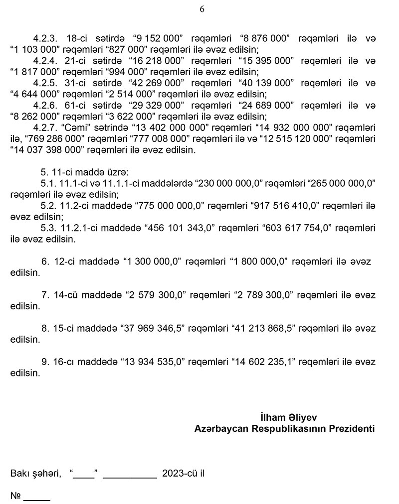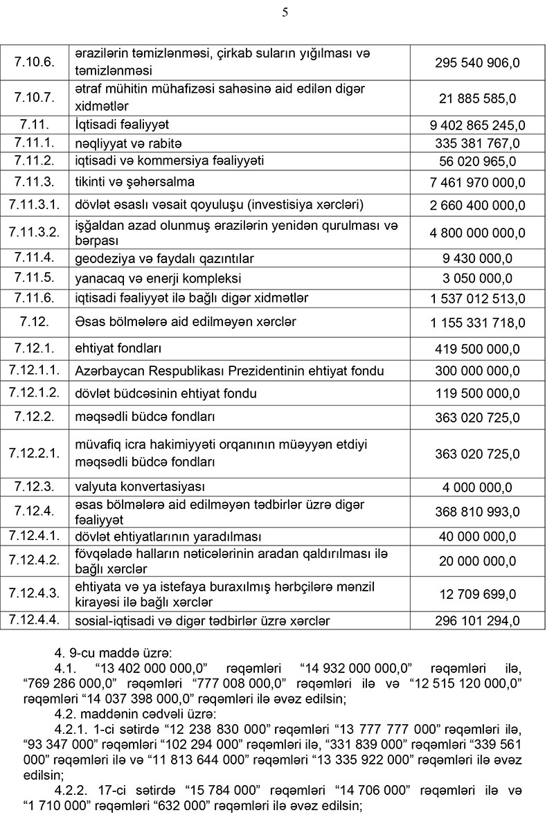 - Azərbaycan Respublikasının işğaldan azad olunmuş Qarabağ və Şərqi Zəngəzurda həyata keçirilən tikinti, bərpa və yenidənqurma işlərinin sürətləndirilməsi ilə bağlı xərclərinin artımı üçün 2 milyard 260 milyon manat. Artımdan sonra bu xərc 5 milyard 260 milyon manat məbləğində olacaqdır;