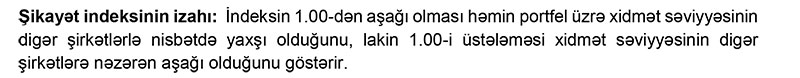 Şikayət indeksinə görə, indeksin 1.00-dәn aşağı olması hәmin portfel üzrә xidmәt sәviyyәsinin digәr şirkәtlәrlә nisbәtdә yaxşı olduğunu, lakin 1.00-i üstәlәmәsi xidmәt sәviyyәsinin digәr şirkәtlәrә nәzәrәn aşağı olduğunu göstәrir.