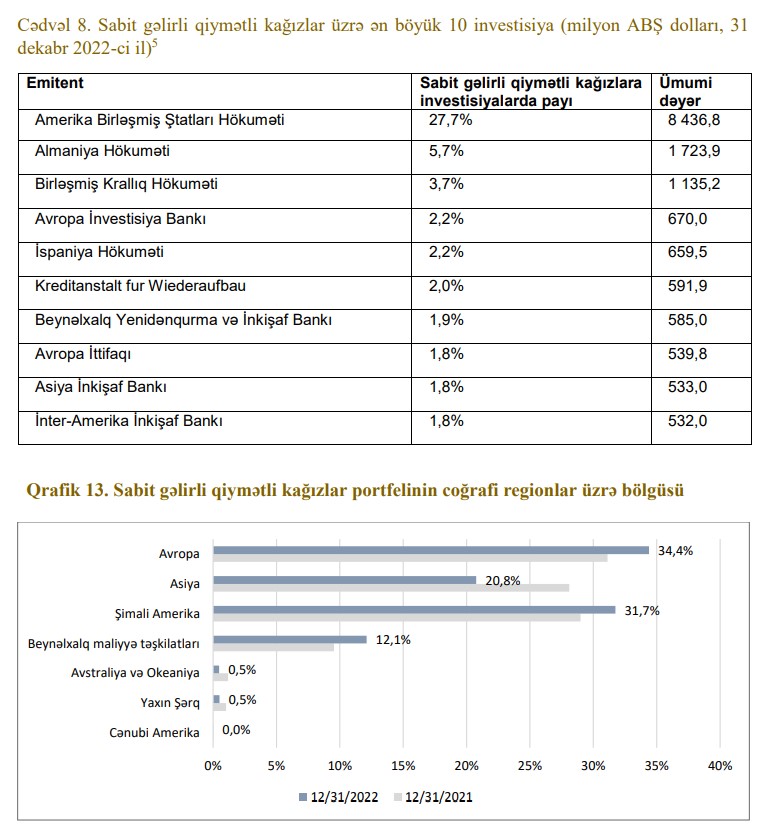 Qeyd edilib ki, ARDNF-nin dövlət borcuna ən böyük investisiyası ABŞ suveren istiqrazlarının payına düşür ki, bu da sabit gəlirli qiymətli kağızlara investisiyaların 27,7%-ni (8 milyard 437 milyon dollar) təşkil etmişdir. Qısası, Azərbaycanın təbii sərvətlərinin satışından əldə edilmiş gəlirlər istiqraz yerləşdirilməsi yolu ilə (ARDNF tərəfindən alınıb) ABŞ xəzinədarlığı tərəfindən cəlb edilərək istifadəsinə başlanılmışdır.