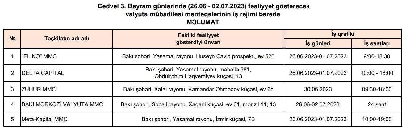 Bayram günlərində (26.06 - 02.07.2023) fəaliyyət göstərəcək valyuta mübadiləsi məntəqələrinin iş rejimi barədə məlumatlar açıqlanıb.