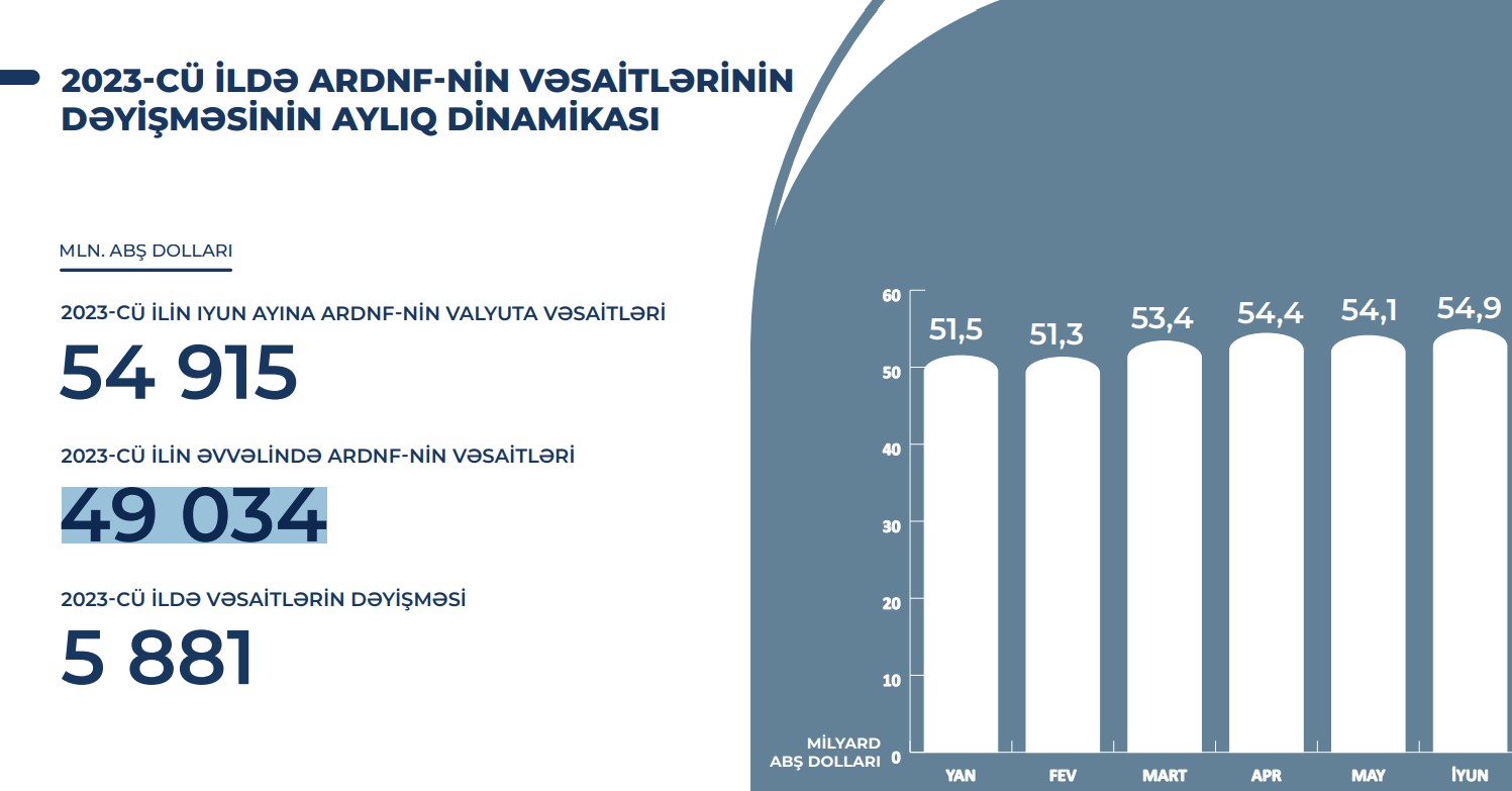 2023-cü ilin İyun ayının sonunda Azərbaycan Respublikası Dövlət Neft Fondunun (ARDNF) valyuta vəsaitləri 54 milyard 915 milyon dollar təşkil edib.