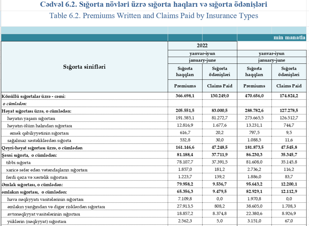 Müqayisə üçün qeyd edək ki, 2022-ci ilin birinci yarısında sığorta şirkətləri tərəfindən 491 milyon 605 min manat sığorta haqları hesablanmışdı. Sığorta haqlarının 366 milyon 698 min manatını (74,6%-ni) könüllü, 124 milyon 907 min (25,4%-ni) manatı icbari sığortalar üzrə olmuşdu. O cümlədən, O cümlədən, cəmi sığorta haqlarının 245 milyon 897 min manatını (təxminən 50%-ni) həyat sığortaları, 245 milyon 708 min manatını (təxminən 50%-ni) qeyri-həyat sığortaları üzrə haqlar təşkil etmişdi.