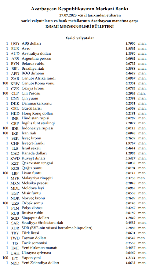 Rəsmi məzənnələr açıqlandı