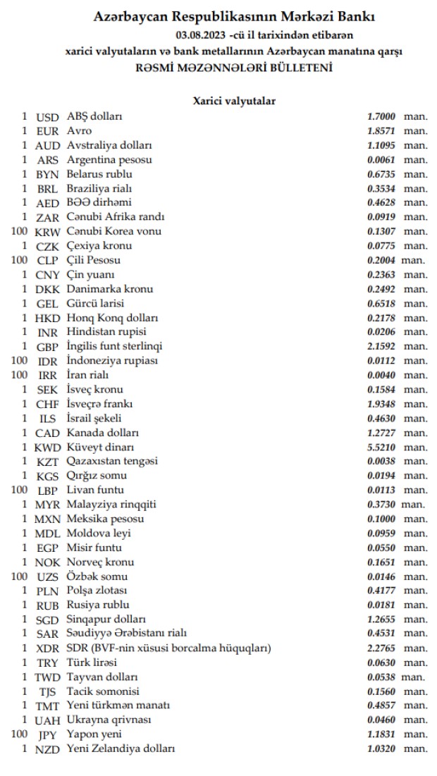 Rəsmi məzənnələr açıqlandı