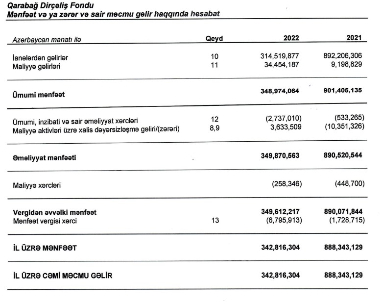 Qarabağ Dirçəliş Fondu 2022-ci ili 342 milyon 816 min manat xalis mənfəət ilə başa vurub. Fond 2021-ci ili 888 milyon 343 min manat xalis mənfəət ilə bağlamışdı. Beləliklə, ötən il Fondun xalis mənfəəti 61,4% və ya 545 milyon 527 min manat azalıb.