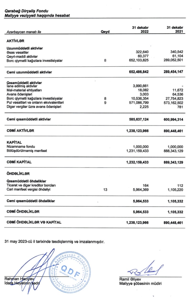 Qarabağ Dirçəliş Fondu bildirib ki, Fond ianələrdən əldə olunan vəsaitin bir qismini Azərbaycan Respublikası Maliyyə Nazirliyinin dövlət istiqrazlarına yerləşdirməklə 34 milyon 454 min manat əlavə gəlir əldə edib (2021-ci il ərzində Fond 9 milyon 199 min manat maliyyə gəliri əldə edib).