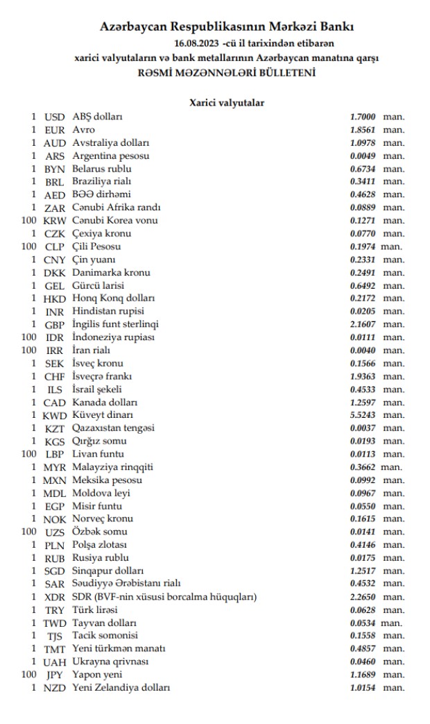 Dolların bazar ertəsi üçün rəsmi məzənnəsi müəyyən olunub