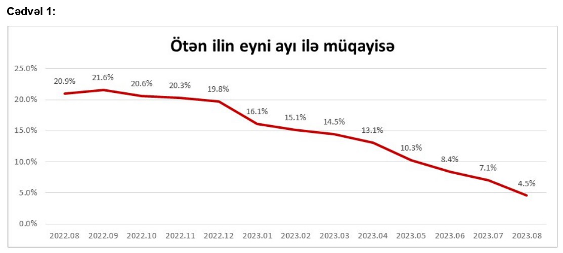 Belə ki, tez köhnələn qida məhsullarının qiymətində keçən ilin avqust ayına nisbətən 6.4% artım, quru, dondurulmuş qida məhsullarının, şirniyyat və spirtsiz içkilərin qiymətində 2.3% artım, spirtli içkilər və tütün məmulatlarının qiymətində 4.6%, gigiyena və təmizlik vasitələrinin qiymətində isə 4.9% artım izlənilib.