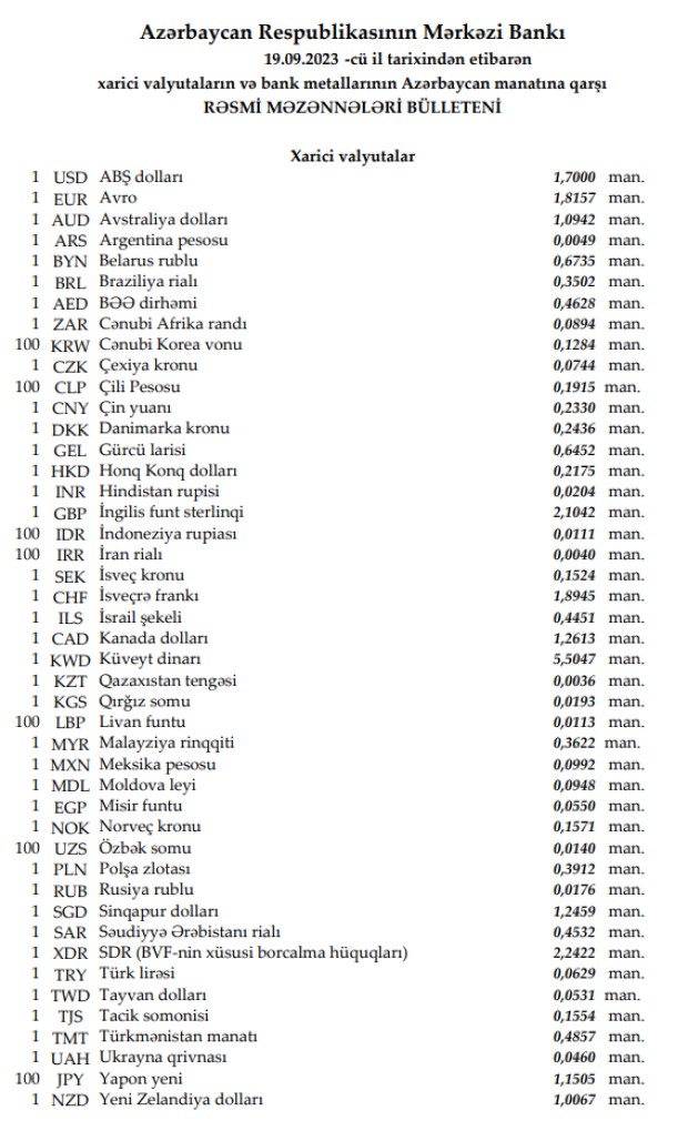 Rəsmi məzənnələr açıqlandı