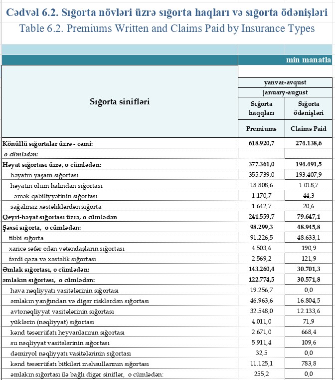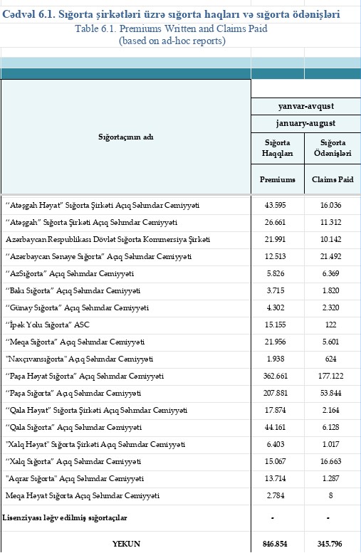 2023-cü ilin yanvar-avqust aylarında Azərbaycandakı 20 sığorta şirkətinin xətti ilə 846 milyon 854 milyon manat sığorta haqqı toplanılıb.
