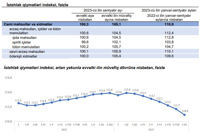 2023-cü ilin yanvar-sentyabr aylarında istehlak qiymətləri indeksi (inflyasiya göstəricisi) 2022-ci ilin yanvar-sentyabr aylarına nisbətən 10,9 faiz, o cümlədən ərzaq məhsulları, içkilər və tütün məmulatları üzrə 12,4 faiz, qeyri-ərzaq məhsulları üzrə 10,1 faiz, əhaliyə göstərilmiş ödənişli xidmətlər üzrə 9,6 faiz artıb.