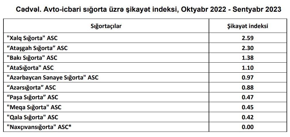 Azərbaycan Mərkəzi Bankı "Oktyabr 2022 - Sentyabr 2023" dövrü üzrə Avto-icbari sığorta üzrə şikayət indeksini açıqlayıb.
