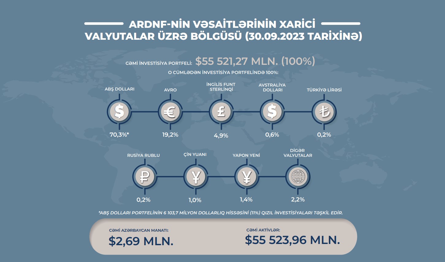 2023-cü il sentyabrın 30-na olan vəziyyətə görə, ARDNF-in aktivləri 55 milyard 523,96 milyon dollar təşkil edib, bunun 2,69 milyon dolları Azərbaycan manatına ekvivalentdir, qalanı digər valyutalarda yerləşdirilib.
