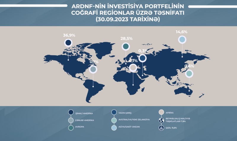 Fondun məlumatına görə, ARDNF-in investisiya portfelinin 36,9%-i Şimali Amerika ölkələrində, 28,5%-i Avropa ölkələrində, 14,6%-i Asiya-Sakit okean regionu ölkələrində, 0,1%-i Cənubi Amerika ölkələrində, 0,1%-i Afrika ölkələri, 0,3%-i Yaxın Şərq ölkələrində, 0,6%-i Avstraliya və Yeni Zelandiyada, 7,9%-i beynəlxalq təşkilatlarda, 11%-i isə qızılda yerləşdirilib.