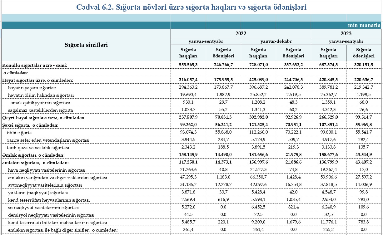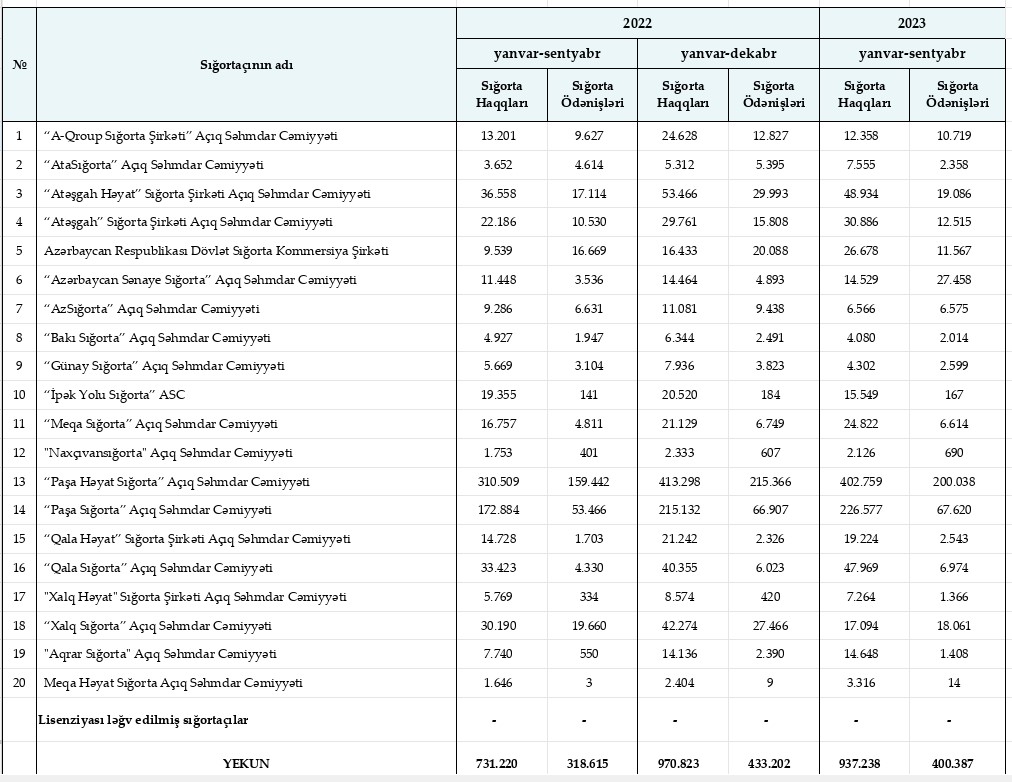 Mərkəzi Bank 2023-cü ilin 9 ayında (yanvar-sentyabr) hesablanmış sığorta haqları və sığorta ödənişləri barədə rəqəmləri açıqlayıb.