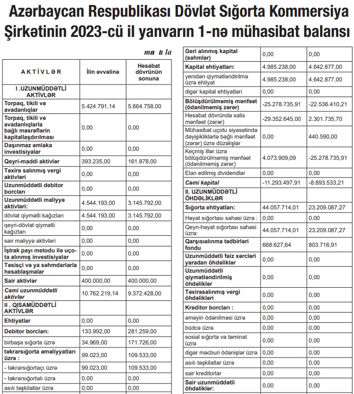 31 dekabr 2023-cü il tarixində Dövlət Sığorta Kommersiya Şirkəti 15 milyon 848 min manat cəmi aktivlərə, 24 milyon 742 min manat cəmi öhdəliklərə malik olub. Ödəliklərin 23 milyon 209 min manataı qeyri-həyat sığortası üzrə sığorta ehtiyatları olub.