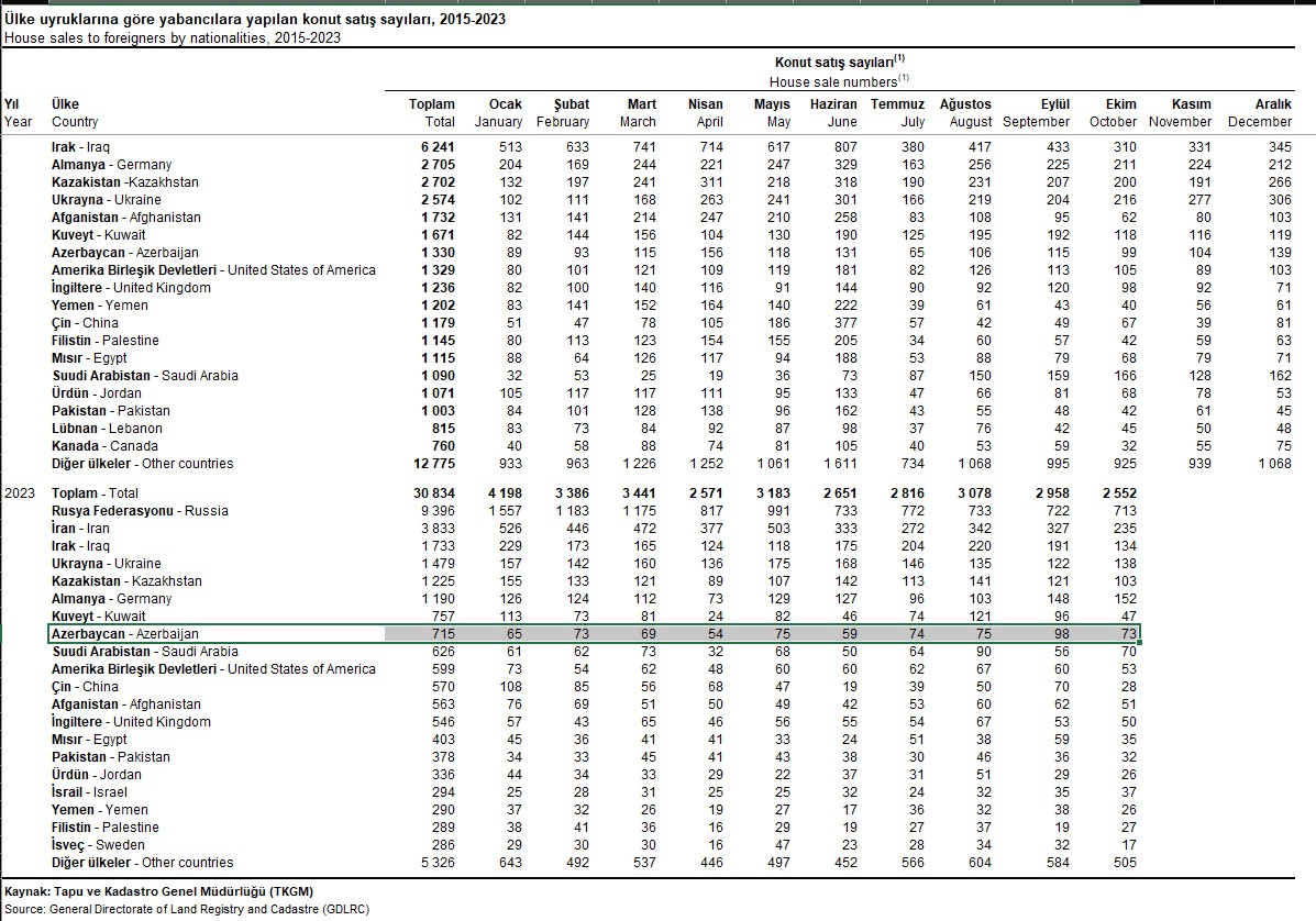 2023-cü ilin 10 ayı ərzində (yanvar-oktyabr) Azərbaycan vətəndaşları Türkiyədə 775 ev alıblar. Bu say ötən ilin 9 ayında 1087 ev idi.