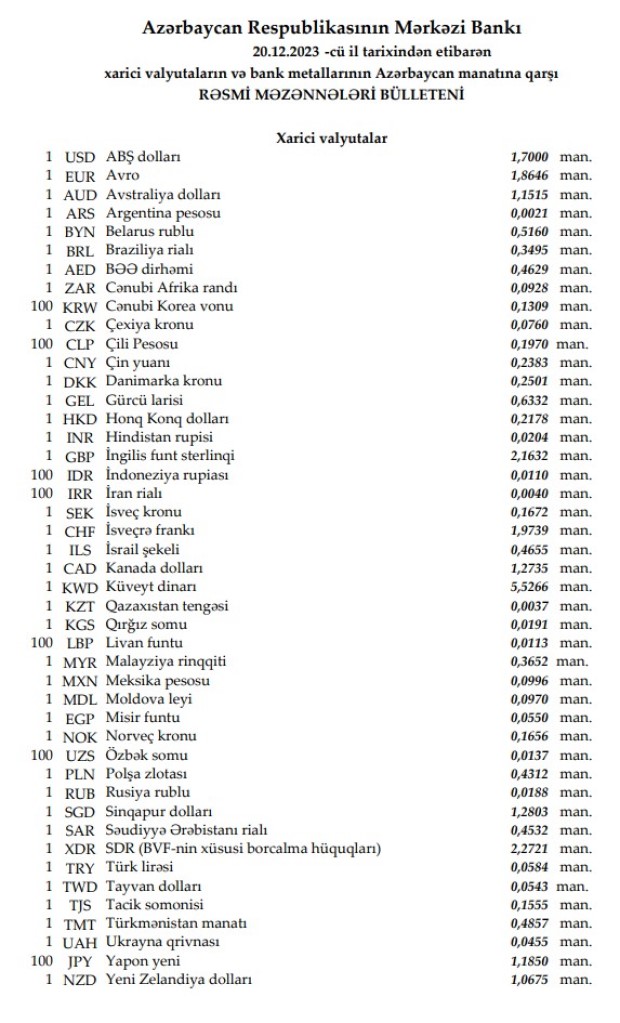 Rəsmi məzənnələr açıqlandı