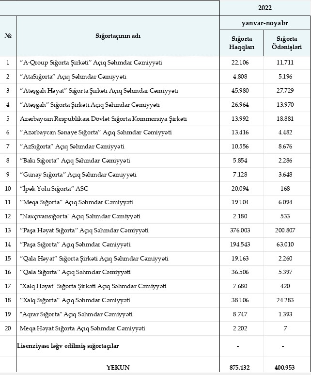 Müqayisə üçün qeyd edək ki, 2022-ci ilin 11 ayı ərzində Azərbaycanın sığorta şirkətləri tərəfindən 875 milyon 132 min manat sığorta haqları hesablanmış, 400 milyon 953 min manat sığorta ödənişləri həyata keçirilmişdi.