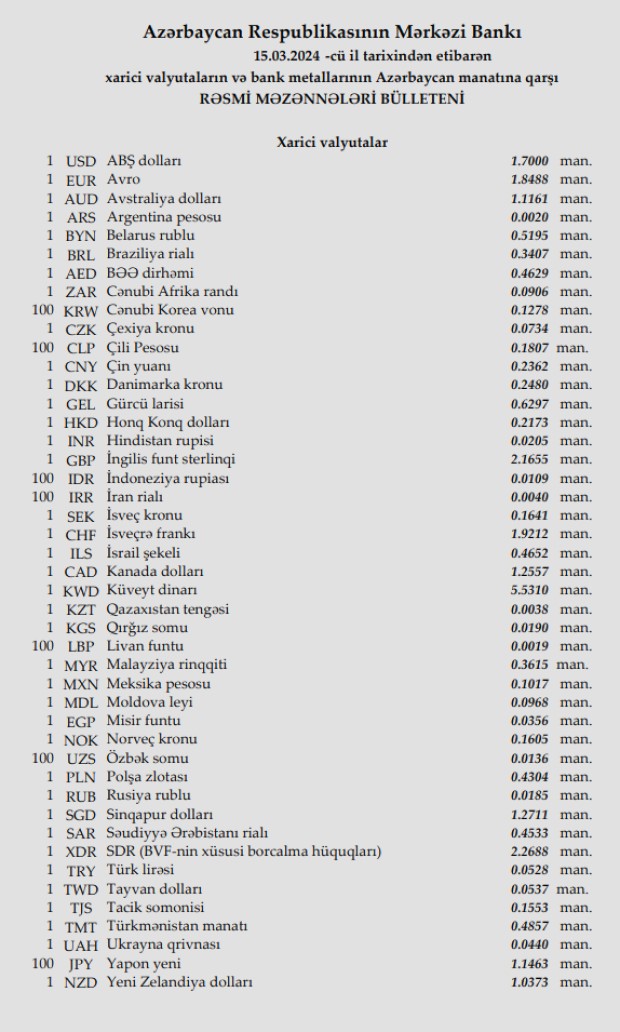 Rəsmi məzənnələr açıqlandı