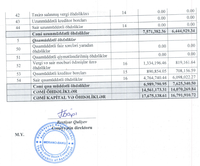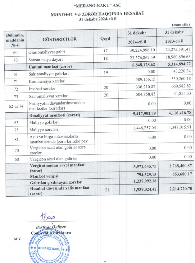 Ötən il "Merano-Baku" əməliyyat mənfəəti 1 milyon 203 min manat və ya 43,5% aratarq 3 milyon 971 min manat təşkil edib. Gəlirdən çıxılmayan 1 milyon 238 min manat xərcə görə, Şirkətin xalis mənfəəti azalıb.