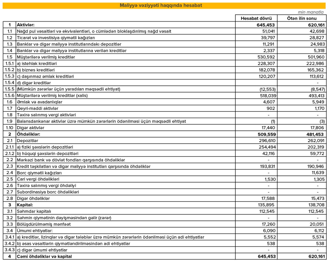 Depozit portfeli 296 milyon 610 min manat təşkil edib (2024: 262 milyon 91 min manat; artım 34 milyon 519 min manat / 13,2%).