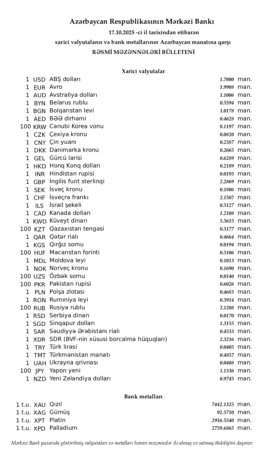 Rəsmi məzənnələr açıqlandı