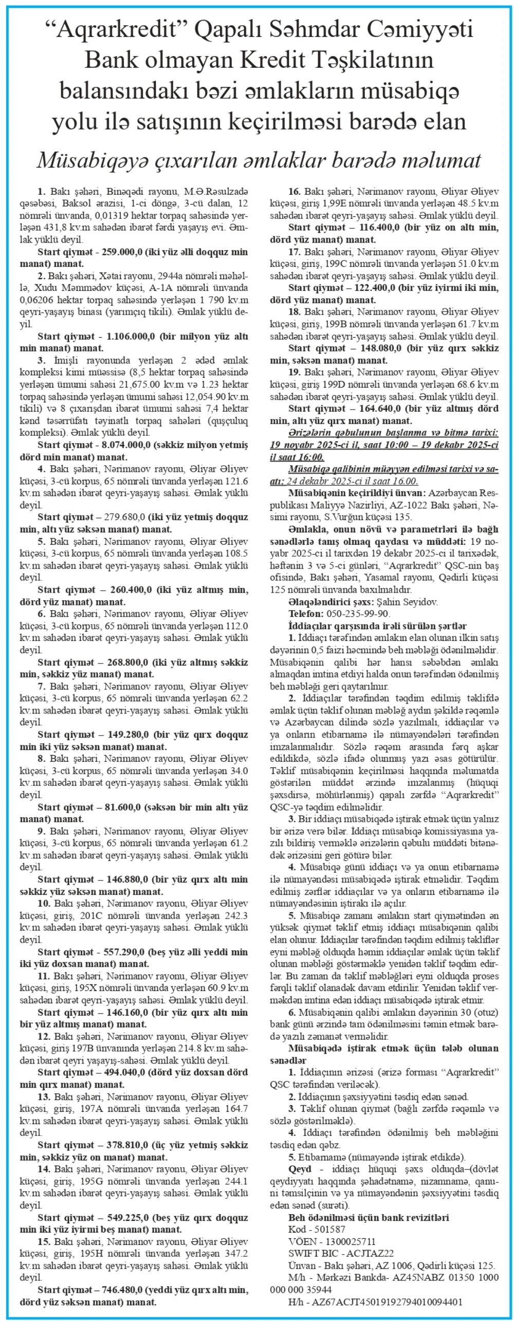 Əmlakla, onun növü və parametrləri ilə bağlı sənədlərlə tanış olmaq qaydası və müddəti: 19 noyabr 2025-ci il tarixdən 19 dekabr 2025-ci il tarixədək, həftənin 3 və 5-ci günləri, “Aqrarkredit” QSC-nin baş ofisində, Bakı şəhəri, Yasamal rayonu, Qədirli küçəsi 125 nömrəli ünvanda baxılmalıdır.