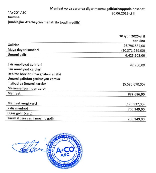 2025-ci ilin ilk 6 ayında (yanvar-iyun) "A+CO" ASC-nin satışdan gəlirləri 26 milyon 797 min manat, xalis mənfəəti 706 min manat təşkil edib.