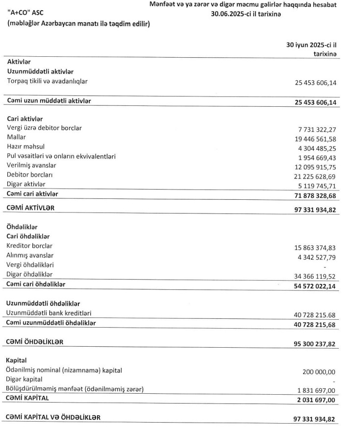 30 İyun 2025-ci il tarixində "A+CO" 97 milyon 332 min manat cəmi aktivlərə malik olub. Şirkət 2024-cü ilin sonunda 97 milyon 451 min manat cəmi aktivlər malik idi.