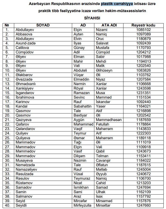 Marja xəbər verir ki, siyahıya plastik cərrahiyyə ixtisası üzrə praktik tibb fəaliyyətinə icazə verilən daha 3 həkim-mütəxəssis əlavə olunub.