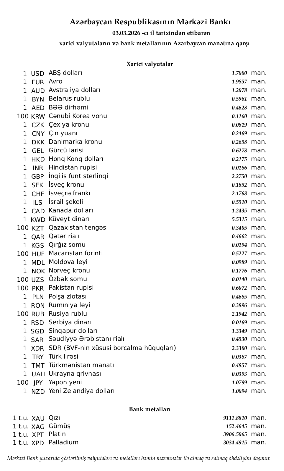Rəsmi məzənnələr açıqlandı