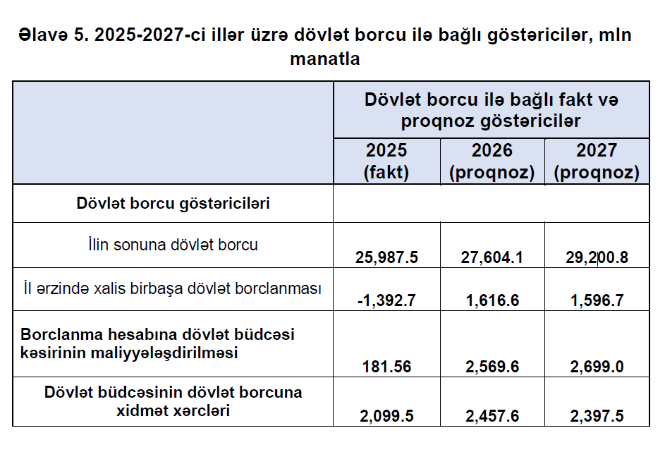 2025-ci ilin sonunda Azərbaycanın dövlət borcu 25 milyard 987.5 milyon manat olub. Beləliklə, 2026 -2027-ci ilərdə (2 ildə) dövlət borcunun 3 milyard 213,3 milyon manat artacağı proqnozlaşdırılır.