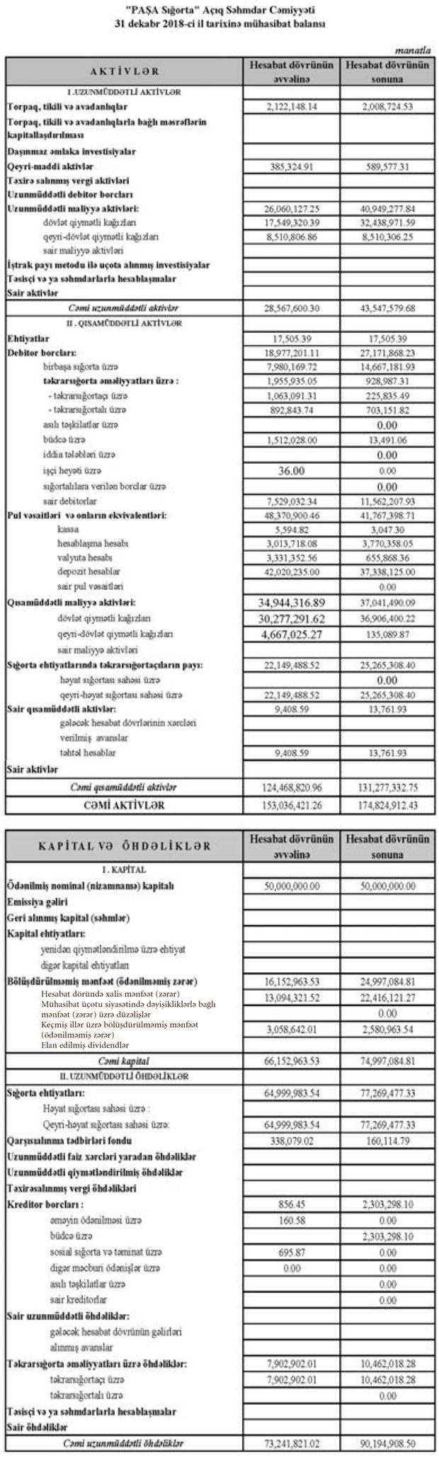 31 Dekabr 2018-ci il tarixində “PAŞA Sığorta” 174 milyon 824 min manat cəmi aktivlərə, 74 milyon 997 min manat cəmi kapitala və 99 milyon 828 min manat cəmi öhdəliklərə malik olub. 31 Dekabr 2017-ci il tarixində “PAŞA Sığorta” 153 milyon 36 min manat cəmi aktivlərə, 66 milyon 152 min manat cəmi kapitala və 86 milyon 883 min manat cəmi öhdəliklərə malik idi.