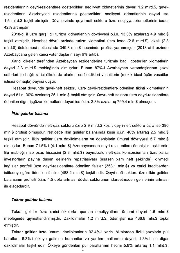Hesabat dövründə cari əməliyyatlar hesabında 6,1 mlrd. dollarlıq (2017-ci ilə nəzərən 3,6 dəfə artım) profisit yaranıb. O cümlədən neft-qaz sektoru üzrə profisit 1,7 dəfə (5,5 mlrd. dollar) artaraq 12,9 mlrd.dollar, qeyri-neft sektoru üzrə CƏB kəsiri isə ötən ilə nisbətən 19,6% (1,1 mlrd. dollar) artaraq 6,8 mlrd. dollar məbləğində olub. Nəticədə neft-qaz sektorunun profisiti qeyri-neft sektoru üzrə cari hesabın kəsirini tam örtüb.