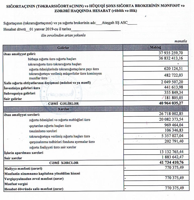 “Marja” Şirkətin maliyyə hesabatlarına istinadən xəbər verir ki, ötən il “Atəşgah Sığorta”nın cəmi gəlirləri 40 milyon 964 min manat, cəmi xərcləri isə 41 milyon 734 min manat təşkil edib. Nəticədə Şirkətin 770 min 375 manatlıq zərəri yaranıb.