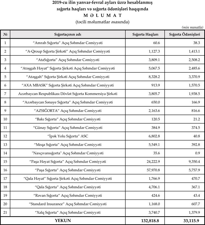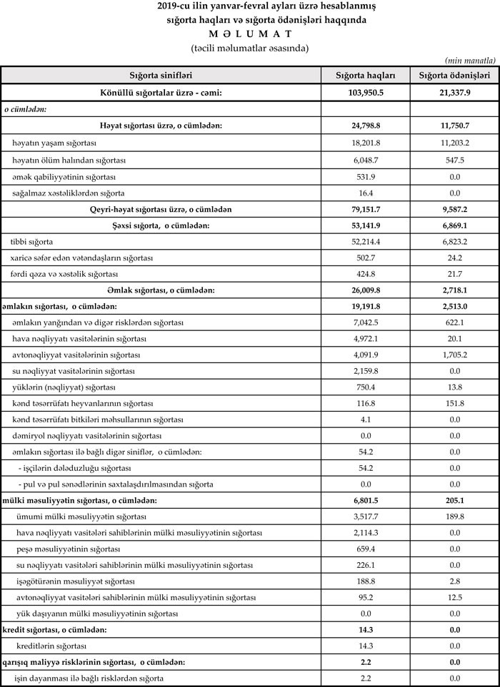 2019-cu ilin yanvar-fevral aylarında ölkədə fəaliyyət göstərən sığorta şirkətləri tərəfindən 132.8 mln. manat məbləğində sığorta haqları toplanıb, 33.1 mln. manat məbləğində sığorta ödənişləri həyata keçirilib.