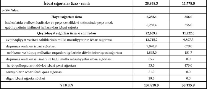 Maliyyə Bazarlarına Nəzarət Palatasının yaydığı məlumata görə, könüllü sığorta bazarı üzrə haqlar 103.9 mln. manat, ödənişlər isə 21.3 mln. manat təşkil edib. İcbari sığorta bazarı üzrə haqlar 28.9 mln. manat, ödənişlər isə 11.8 mln. manat olub.
